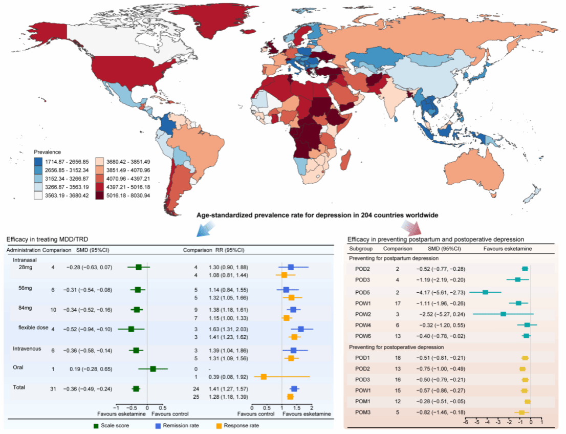 艾司氯胺酮是一种用于治疗抑郁症及相关精神病症状的新型药物,已在美国、英国和欧洲获得临床批准。既往研究证实,艾司氯胺酮可快速缓解抑郁症状,在难治性抑郁症(TRD)、重性抑郁症(MDD)等疾病的治疗中展现出独特优势。然而,其长期疗效、成瘾风险以及在不同类型抑郁中的预防作用仍存争议。