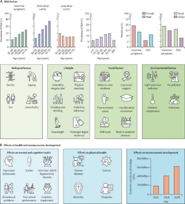 综述首先评估了中国睡眠健康的流行病学现状。文章指出,不良睡眠已给中国的公众健康和经济发展带来了日益沉重的负担。尽管部分研究显示平均睡眠时长有所增加,但失眠和阻塞性睡眠呼吸暂停(OSA)的患病率呈上升趋势,构成了严峻挑战。导致睡眠问题的风险因素复杂多样,涉及生物、生活方式、社会和环境四大领域。睡眠障碍对身心健康具有深远影响,不仅显著增加抑郁、焦虑、认知损害等精神健康问题的风险,还会加剧心血管疾病、癌症等多种慢性躯体疾病的发生率与死亡率。