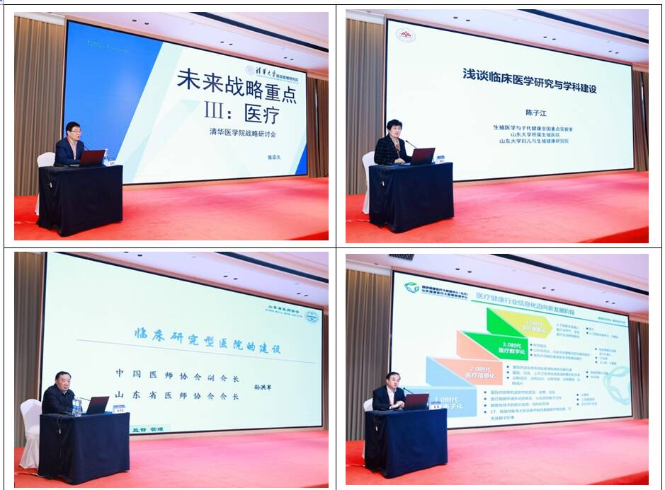 论坛邀请清华大学医学院副院长张宗久,中国科学院院士陈子江,中国医师协会副会长、山东省医师协会会长孙洪军,山东省医疗健康大数据管理中心主任李磊分别作《高质量发展开启精准医学服务》《浅谈临床医学研究与学科建设》《临床研究型医院的建设》《山东省卫生健康行业高质量数据集建设思路研究》的主旨报告。