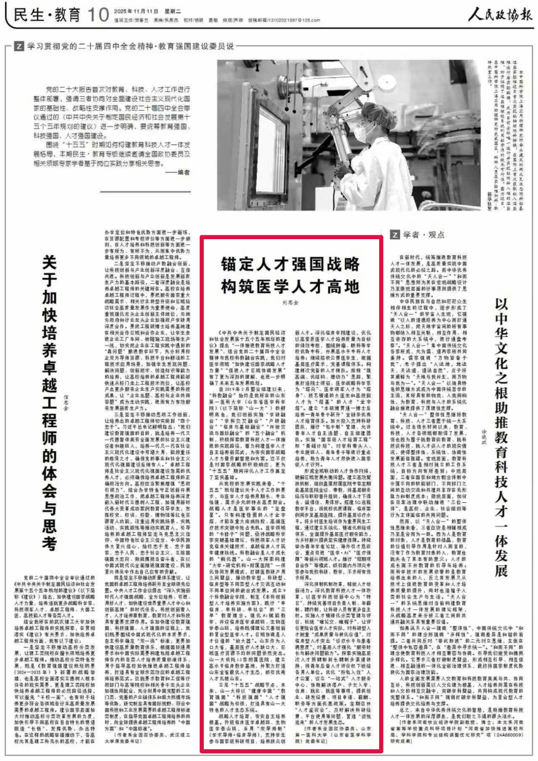 11月11日,《人民政协报》以“锚定人才强国战略 构筑医学人才高地”为题,刊发校(院)党委书记刘思金署名文章。全文转载如下:
