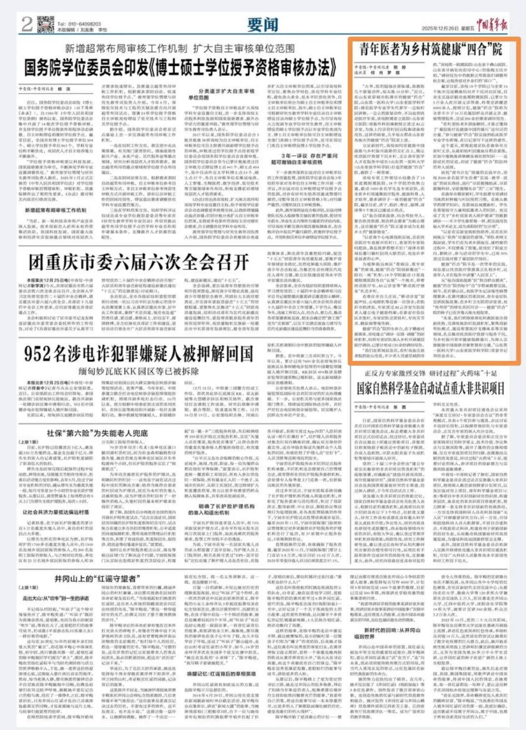 12月26日,《中国青年报》要闻版以“青年医者为乡村筑健康‘四合’院”为题,深度报道了校(院)整合13家直属附属医院、18个学院的优势力量,联动1000余名学生及专家团队,在全省乡村搭建集医疗服务、健康科普、人才培育、需求调研于一体的健康“四合”院的创新实践。全文转载如下:
