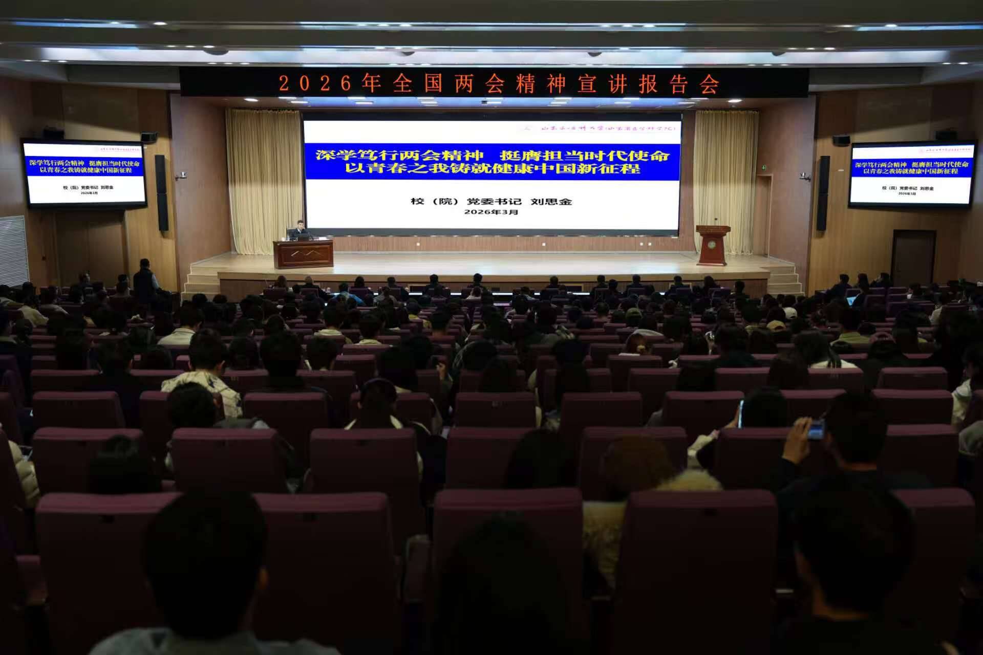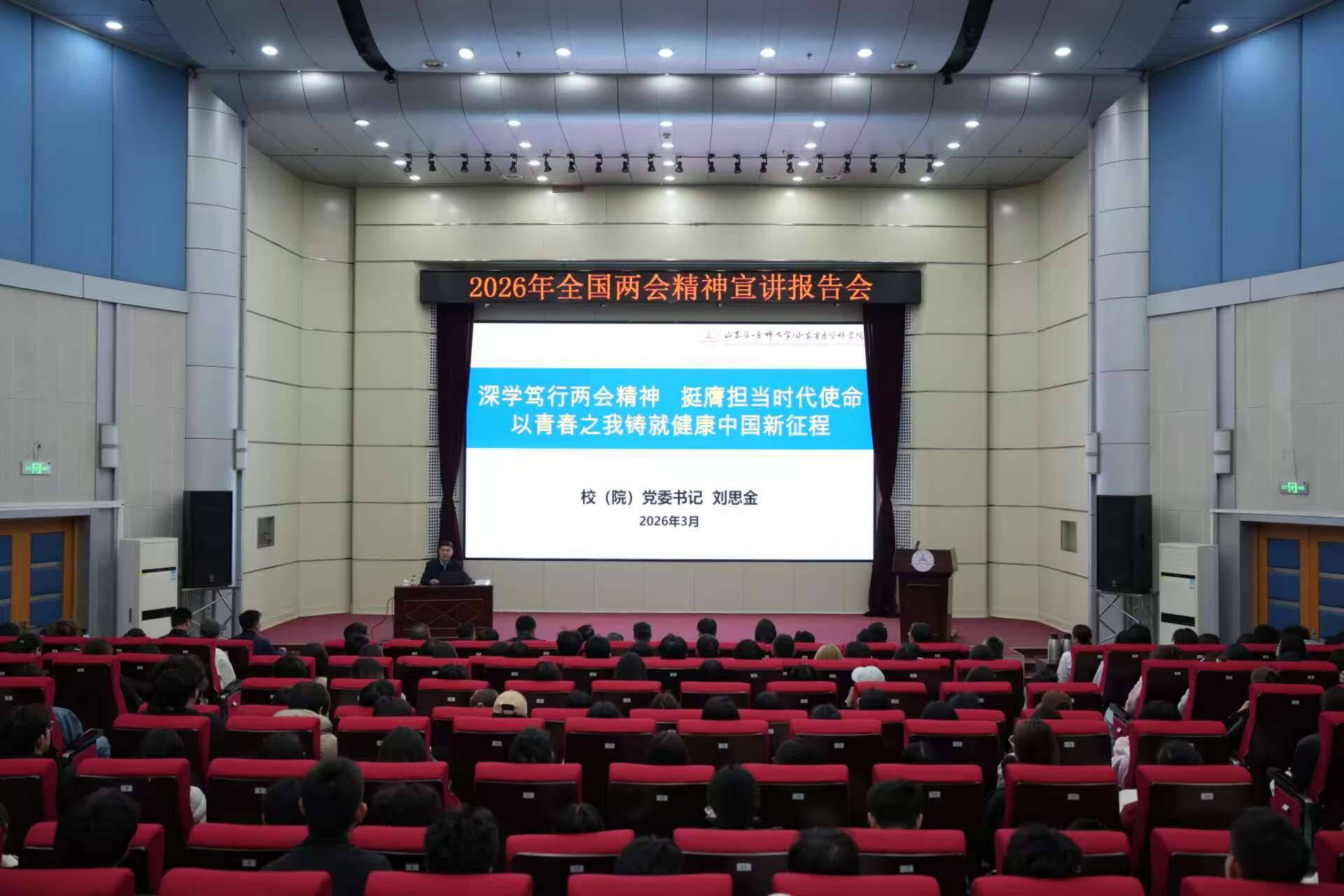 为深入学习贯彻2026年全国两会精神,切实将青年学子思想和行动统一到党和国家重大决策部署上来,引导广大青年紧跟时代步伐、勇担时代使命。3月30日和31日,校(院)党委书记刘思金以《深学笃行两会精神 挺膺担当时代使命 以青春之我筑就健康中国新征程》为题,先后在济南校区、泰安校区为青年学子讲授思政课并作专题宣讲报告,以亲历者视角生动解读全国两会精神,让全国两会声音直达校园。校(院)党委委员、副校(院)长贾海宁主持宣讲报告会。