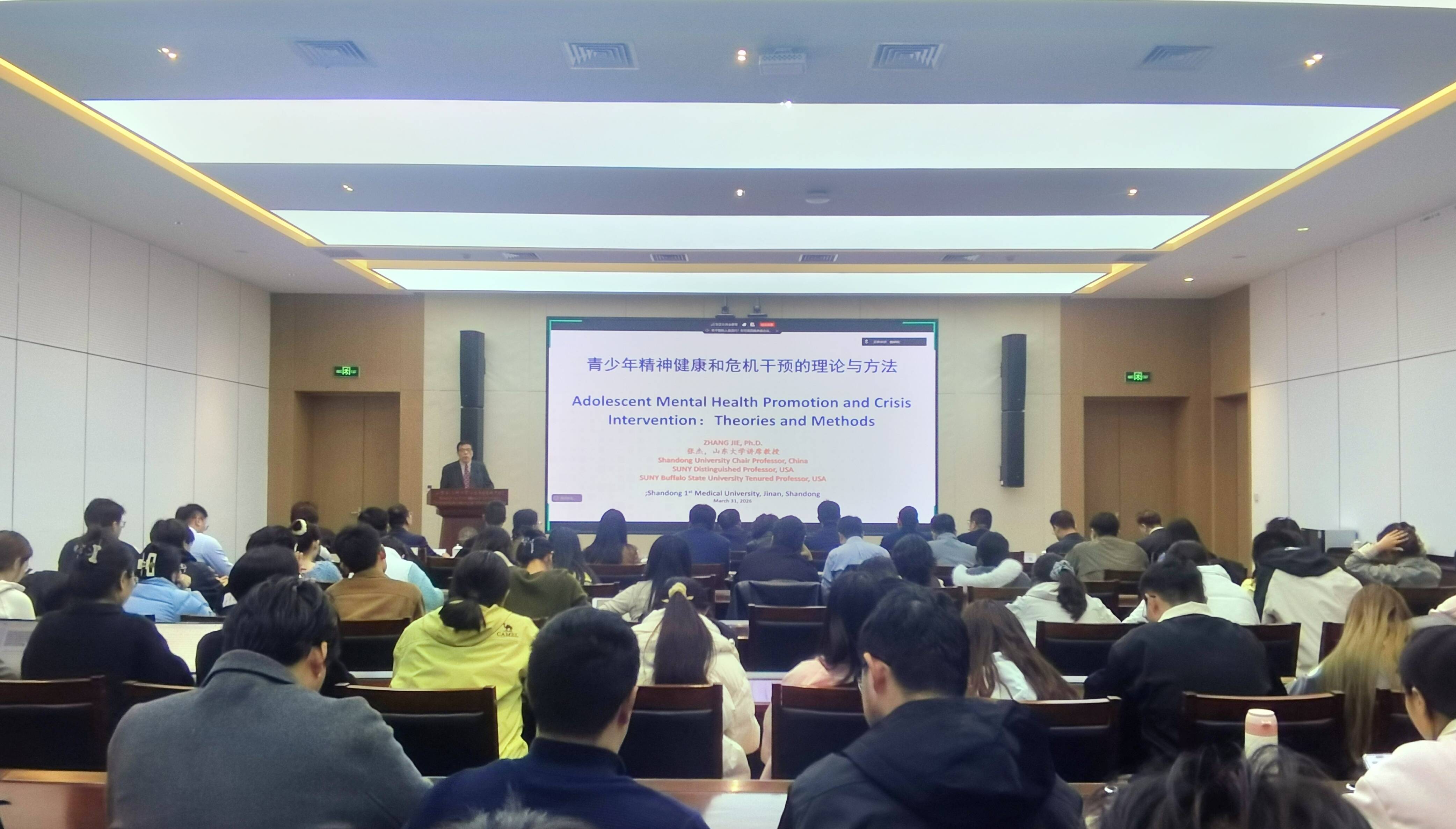 报告中,张杰教授以《青少年精神健康和危机干预的理论与方法》为题,系统阐释了心理扭力理论与社会参照论,深入分析了中美青少年心理健康问题变化趋势及成因。他指出,我国青少年心理健康保障水平持续提升,得益于辅导员制度与社会支持体系的有力支撑。针对当前心理健康筛查体系短板,他提出从“状态筛查”向“特质筛查”转变,构建包含7项核心特质的风险预测模型,并详细介绍了山东大学青少年心理健康关爱工程试点方案与课程体系,为校(院)青少年心理健康干预提供了全新思路与实践范式。