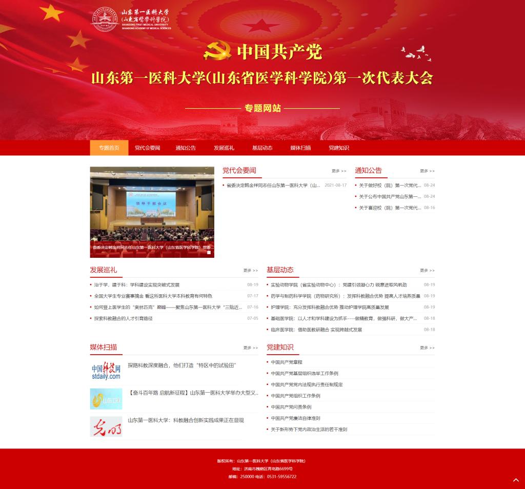 为使全校师生医务员工全面地了解和掌握党代会筹备工作进展,及时关注会议召开盛况,切实做好大会的宣传动员、舆论引导、思想教育和新闻报道工作,党委宣传部、新闻中心共同打造、推出“中国共产党山东第一医科大学(山东省医学科学院)第一次代表大会专题网站”,并于8月24日正式上线。
