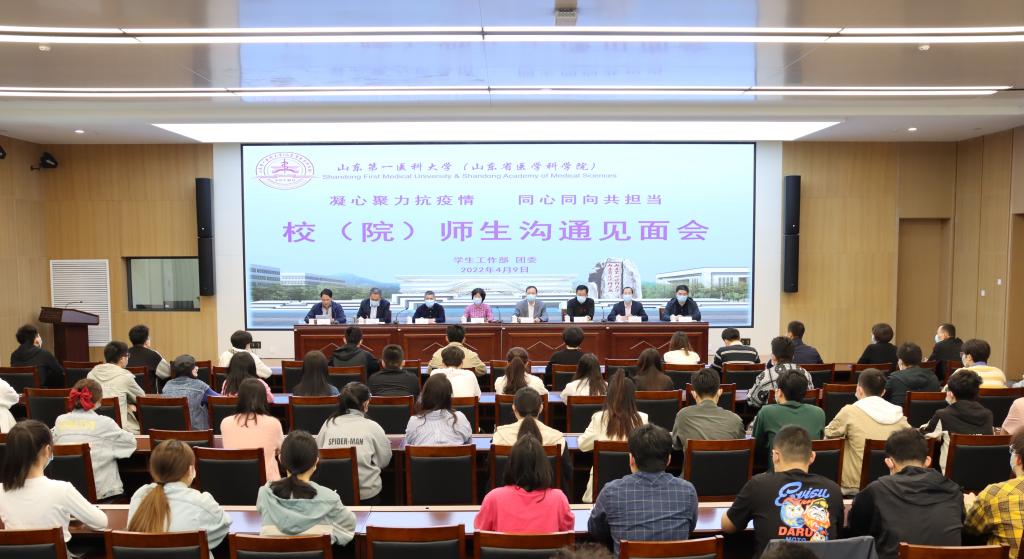 为畅通学生利益诉求渠道,做好疫情防控状态下的学生工作,4月9日下午,山东第一医科大学(山东省医学科学院)在济南主校区召开以“凝心聚力抗疫情,同心同向共担当”为主题的师生沟通见面会。校(院)党委副书记吕晓黎,党委委员、副校(院)长张贤雷出席会议并讲话。