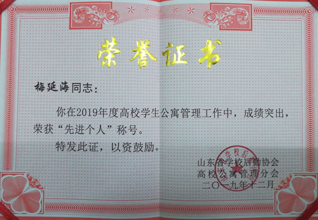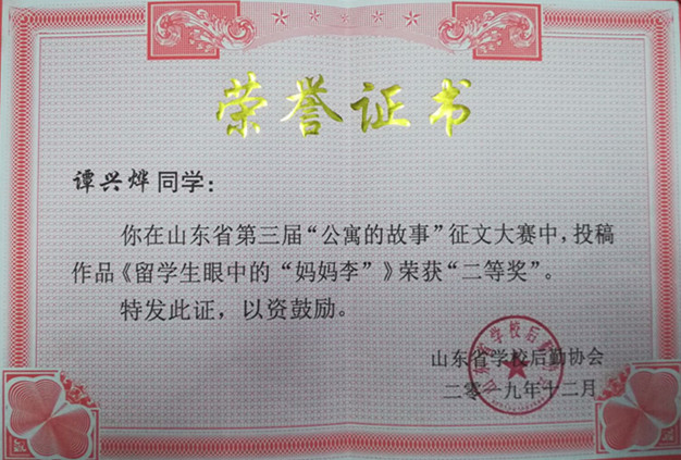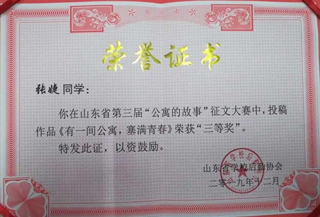 我校(院)获2019年山东省“公寓的故事”活动优秀组织奖,谭兴烨同学的《留学生眼中的“妈妈李”》、张婕同学的《有一间公寓,塞满青春》分获征文大赛二、三等奖,学生工作处梅延海同志获2019年度高校学生公寓管理工作“先进个人”。