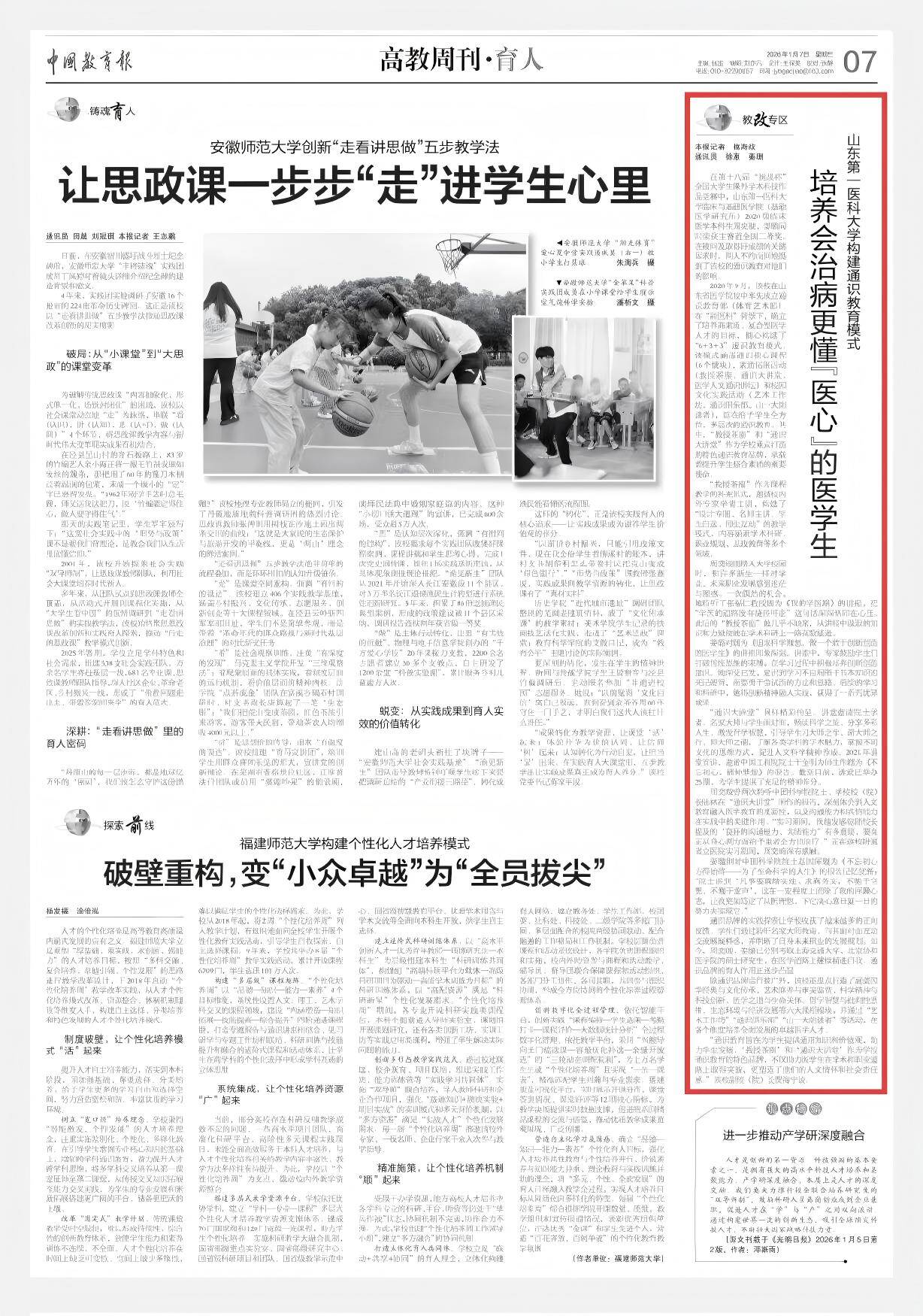 1月7日,《中国教育报》以“山东第一医科大学构建通识教育模式 培养会治病更懂‘医心’的医学生”为题,报道了校(院)“6+3+3”通识教育模式对医学生的深刻影响。全文转载如下: