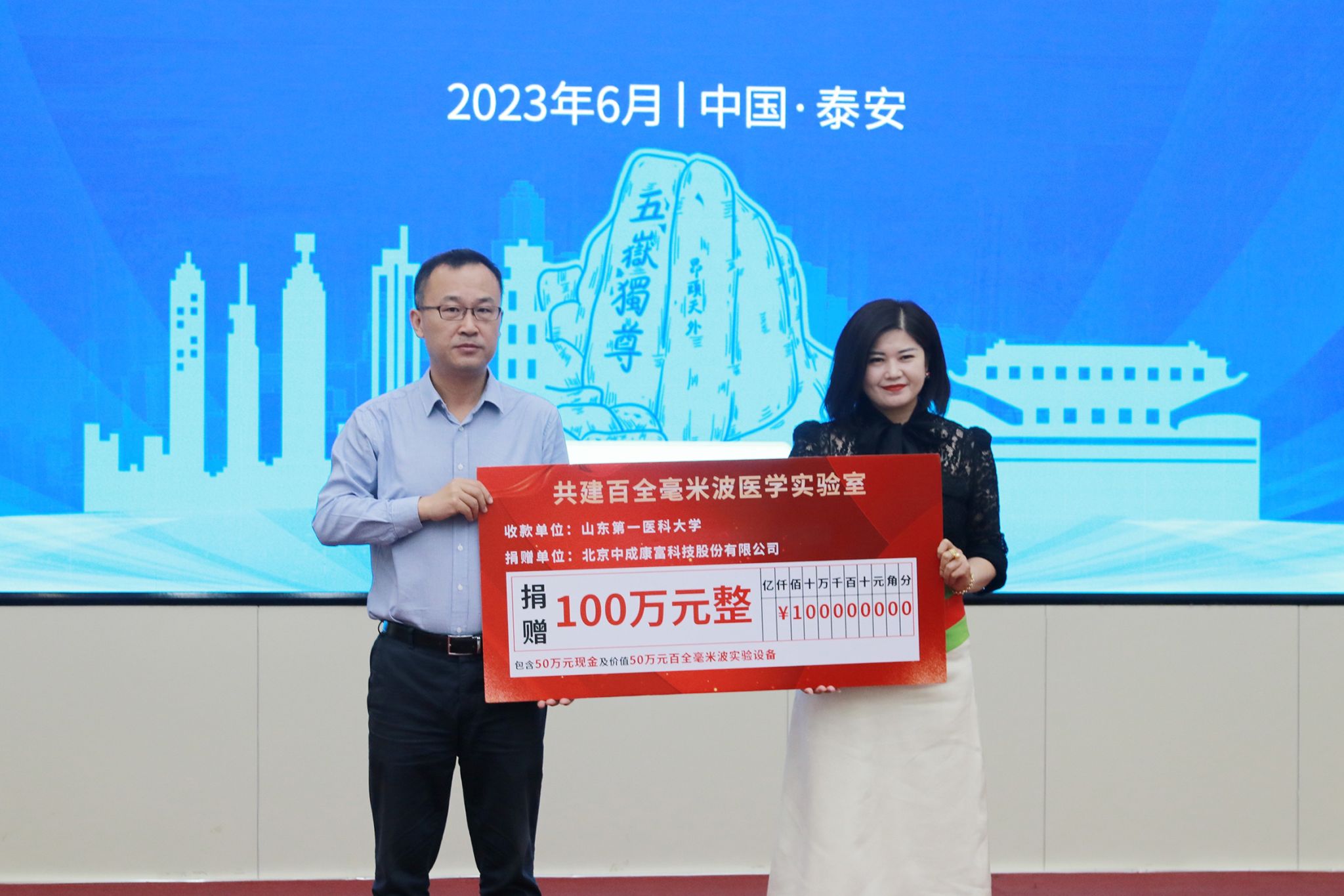 6月8日上午,校(院)与北京中成康富科技股份有限公司合作共建百全毫米波医学实验室成立大会在泰安长城路校区举行。副校(院)长刘传勇,北京市政协副秘书长、农工党北京市委员会副主委江欣,北京中成康富科技股份有限公司董事总经理张雪出席大会并致辞。