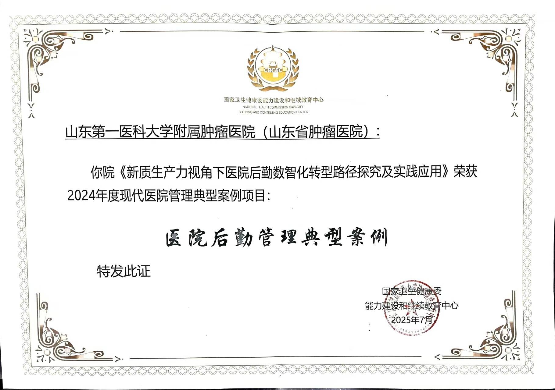 近日,国家卫生健康委能力建设和继续教育中心正式公布“2024年度中国现代医院管理典型案例”评选结果,山东第一医科大学附属肿瘤医院报送的案例《新质生产力视角下医院后勤数智化转型路径探究及实践应用》荣获现代医院管理典型案例。