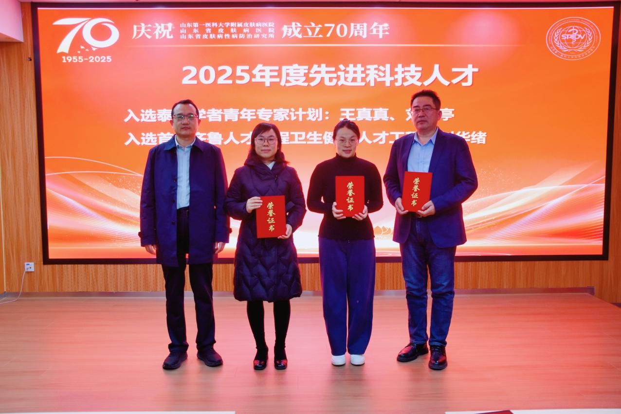 党委副书记田洪青为2025年度先进科技人才奖获得者王真真、刘亭亭、刘华绪颁发荣誉证书。