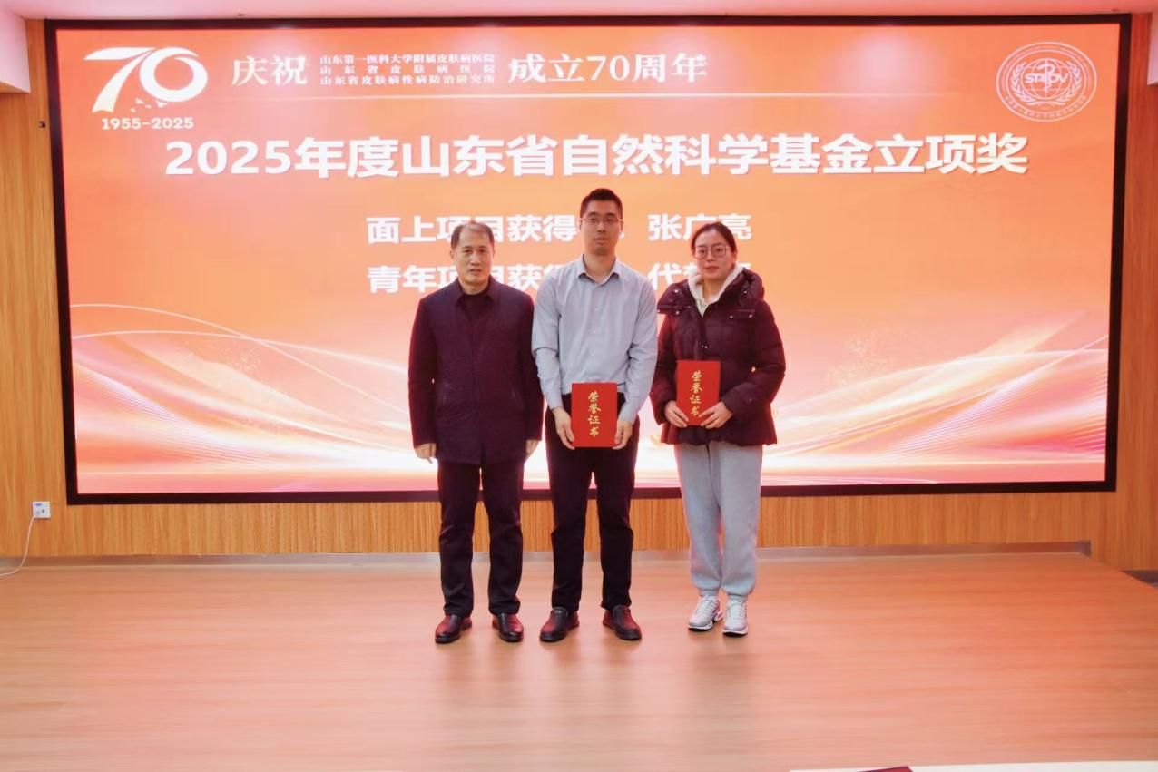 院长张福仁为2025年国家自然科学基金立项奖获得者代表时培殿、赵晴、于越乾颁发荣誉证书。