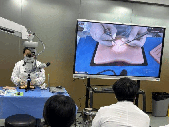 理论讲授后,两位讲师分别进行了细致的实操演示。王爽副主任医师在猪眼上逐步展示了角巩膜缝合的规范流程,从持针、进针到打结,动作稳健精准。禚伟主治医师则在仿真皮肤模型上演示了皮肤裂伤缝合的多种技法,手法娴熟流畅,对细节的把握尽显功力。学员们近距离观摩,不时记录关键步骤。