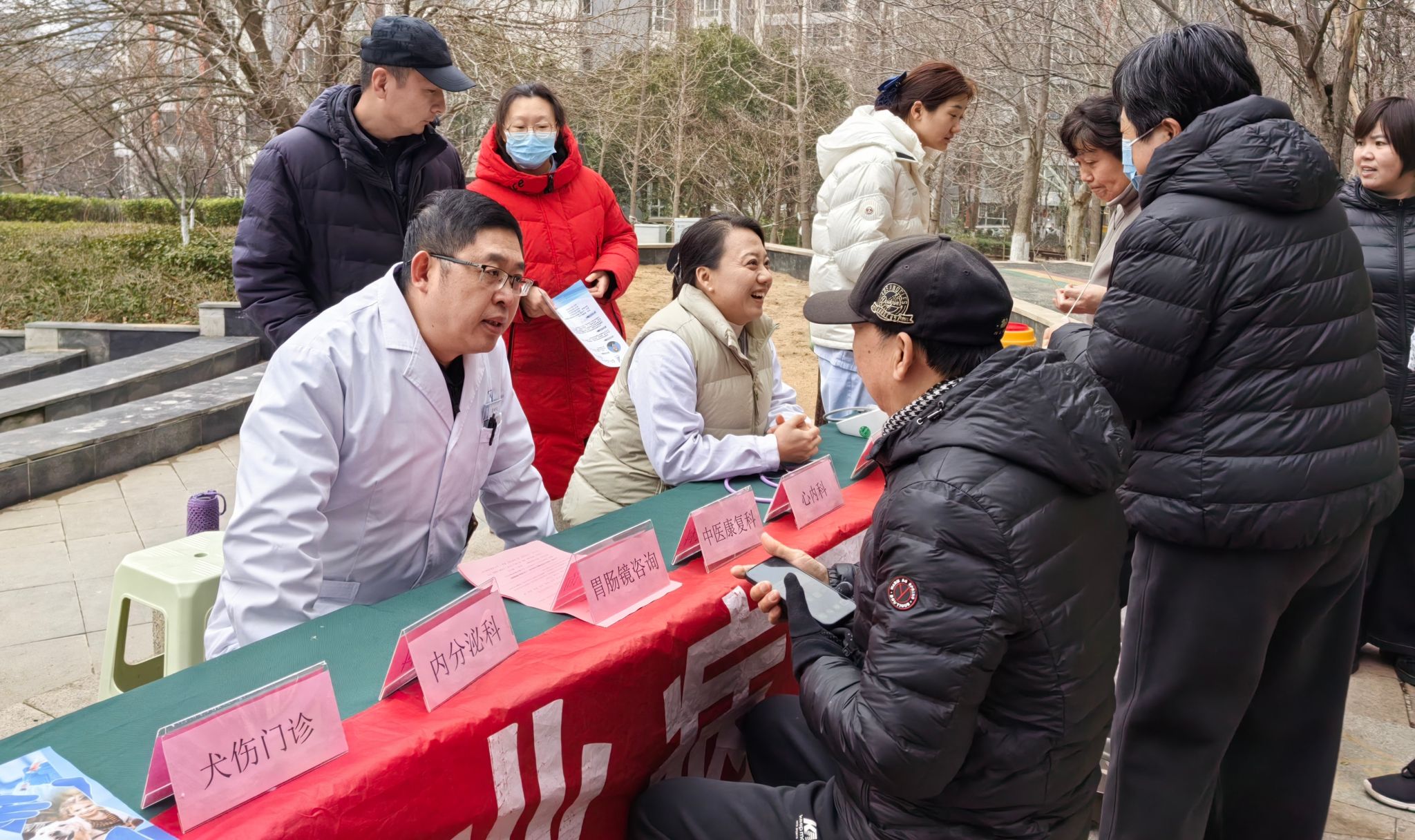 义诊现场,团委的青年志愿者们积极协助维持秩序,引导居民有序问诊。来自医院呼吸内科、内分泌科、心内科、中医康复科等多个科室的专家们,耐心细致地为前来咨询的社区居民提供专业的诊疗建议和个性化的健康指导。专家们就居民普遍关心的春季高发的呼吸系统疾病、胃肠镜检查注意事项、犬伤规范处置流程及成人疫苗接种等健康问题进行了详尽解答,有效扫除了居民的健康知识盲区。护理团队有条不紊地为居民提供免费的血压、血糖检测服务,并根据检测结果进行一对一的健康宣教,发放健康科普手册,积极引导居民树立“早预防、早发现、早治疗”的健康理念,切实增强了群众的自我保健能力。