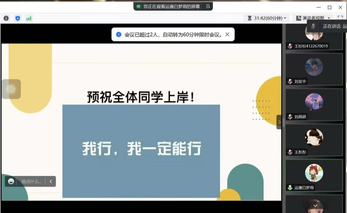 本次线上班会缓解了同学们的心理压力与焦虑,使同学们能够正确自我定位,明确发展方向,为同学们接下来的考试加油鼓劲。学院将更加重视学生的心理健康,不断加强心理健康教育,以提高大学生的心理抗压能力,展现大学生良好的精神风貌。