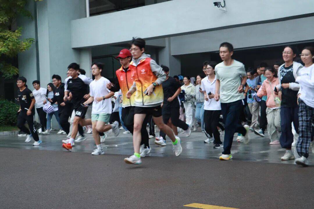 随着奔跑指令发出,身着运动装的同学们陆续出发,4公里的环校道路上瞬间涌动起青春暖流。雨水打湿了衣衫,却挡不住奔跑的热情,脚步声与雨滴声交织成独特的奋进旋律。大家沿着精心设计的路线穿梭校园,用脚步丈量土地,用汗水诠释担当。