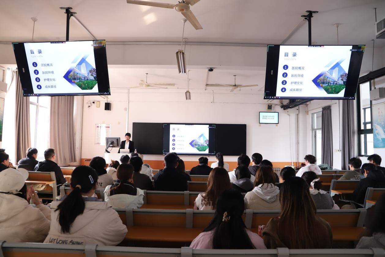 座谈结束后,招聘团队面向护理学院毕业班学子开展专场宣讲,她们详细解读了本次招聘岗位的职责要求、薪资福利、晋升渠道等同学们关心的内容,针对同学们提出的“护士岗位的培训体系”“医院住宿保障”“试用期考核标准”等问题,逐一耐心解答,现场氛围热烈,充分展现出同学们对优质医疗岗位的高度关注与求职热情。
