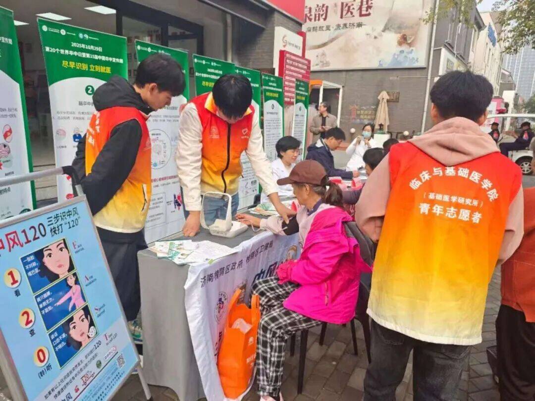 青春脚步丈量社区,专业知识服务百姓。近日,临床与基础医学院“健康使者”大学生社会实践服务团,联合附属省立医院专家团队以及槐荫区卫生健康委员会,走进槐荫区印象济南商圈党群服务中心,持续开展以“中风识别与预防”为主题的“医心呵护”爱心义诊活动。