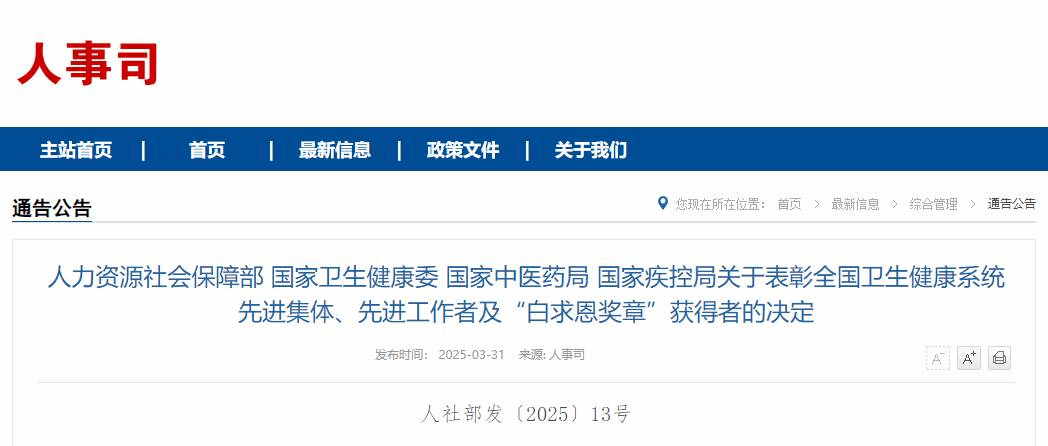 3月31日,人力资源社会保障部、国家卫生健康委、国家中医药局、国家疾控局联合印发《关于表彰全国卫生健康系统先进集体、先进工作者及“白求恩奖章”获得者的决定》,授予326个单位“全国卫生健康系统先进集体”称号,授予749名同志“全国卫生健康系统先进工作者”称号,授予30名同志“‘白求恩奖章’获得者”称号。