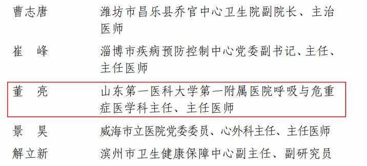 董亮,中共党员,教授,主任医师,博士研究生导师,山东第一医科大学第一附属医院(山东省千佛山医院)呼吸与危重症医学科主任,山东省呼吸疾病研究所所长,担任国家呼吸质控中心委员,山东省新型冠状病毒肺炎疫情处置工作指挥部医疗救治专家组组长,山东省卫健委呼吸质量控制中心主任。长期从事支气管哮喘、慢性阻塞性肺疾病、肺部肿瘤的诊断与治疗,以及危重症抢救与治疗,主持山东省新冠肺炎疫情救治工作,具有突出贡献,获得国家抗击新冠肺炎疫情先进个人,五一劳动奖章;致力于支气管哮喘的防治工作以及生物靶标的发现探索,以第一作者或通讯作者在国际专业杂志(SCI收录期刊)发表论文100余篇。承担国家自然基金面上项目五项,国家重点研发计划,山东省重点研发计划三项,承担山东省科技示范工程重大专项子课题。获得山东省科技进步二等奖(第壹位),山东省医学科技一等奖。