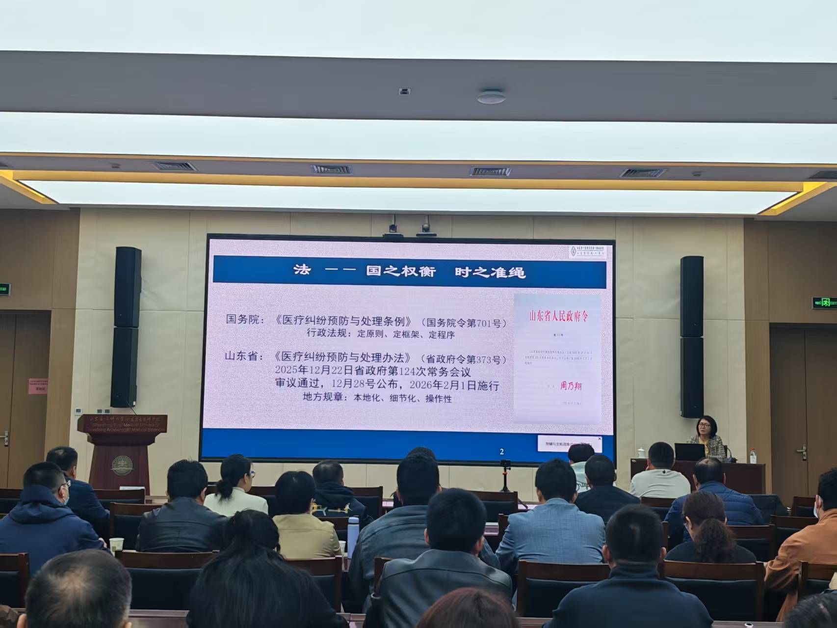 培训会上,刘永梅教授围绕《山东省医疗纠纷预防和处理办法》的核心内容,结合近年来省内典型医疗纠纷案例,对办法中医疗纠纷的预防措施、处置流程、各方权责等关键条款进行了深入拆解与细致解读。她重点强调了医疗机构在诊疗规范、医患沟通、病历管理等方面的核心责任,结合案例剖析了诊疗操作不规范、知情同意不到位、应急处置不及时等常见纠纷诱因,明确了医疗纠纷预防与处置的关键节点和实操要求,同时就如何细化落实医疗核心制度、强化病历质控、提升医患沟通效能等内容分享了实践经验,为参会人员提供了可借鉴、可操作的工作指引。